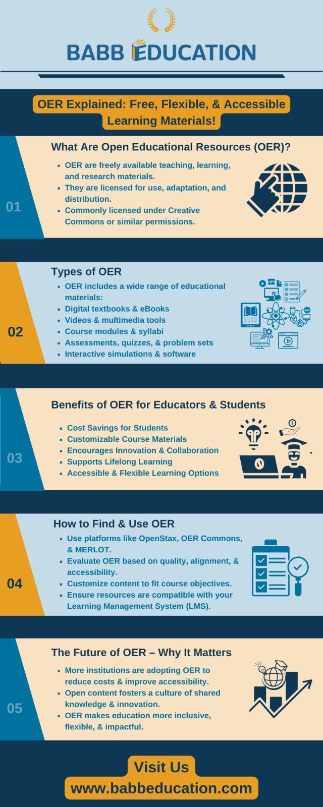 This infographic explains what OER is, types and benefits of OER, how to find and use OER and the future of OER.
